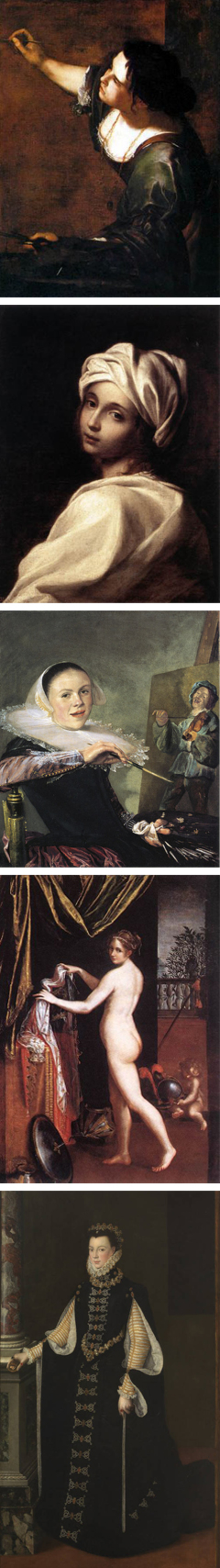 Entre las pioneras de esta práctica artística figuran María Ornani, Antonia Uccello,Margarita van Eyck o Sor Bárbara Ragnoni. Destacaron, igualmente, Sofonisba Anguissola - en el siglo XVI-, Isabel Sirani -en el siglo XVII- y su contemporánea Artemisa Gentileschi, una de las artistas más prolíficas de su tiempo cuyos trabajos han gozado de especial trascendencia en la Historia del Arte, aunque no hayan sido reconocidas todas sus obras como propias hasta bien entrado el siglo XX. Uno de sus autorretratos, catalogado durante años como Alegoría de la pintura, no le fue atribuido hasta 1962; prueba de la tardanza que ha llevado el reconocimiento de la labor de una artista catalogada por la conferenciante como “revolucionaria para su tiempo”.